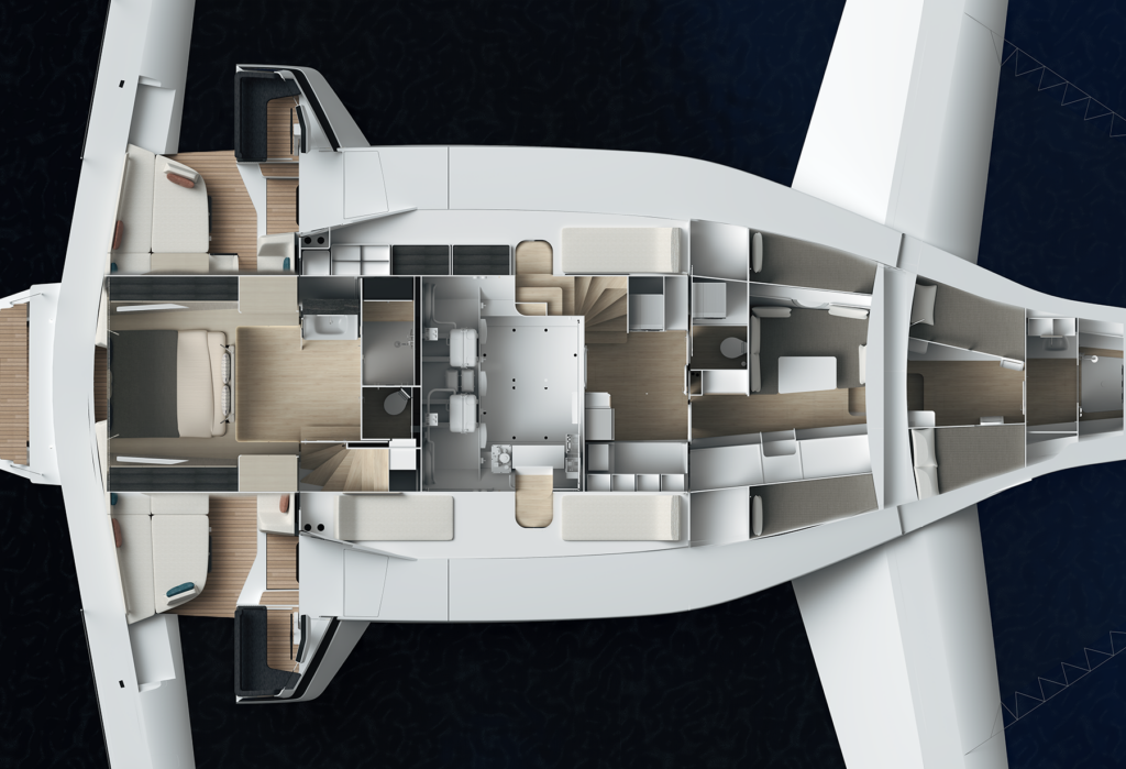 ANAHITA is built in pre-preg carbon and infused using cutting-edge processes, the signature of bespoke, high-precision construction. Her exceptional stability ensures unmatched comfort and safety, even in the most demanding sea states. The first hull, already sold, is under construction in Brittany and scheduled for launch in 2027.